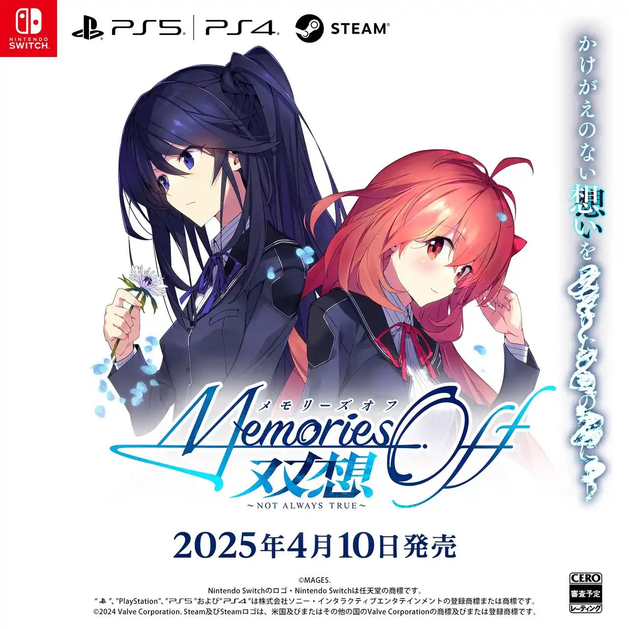 《秋之回忆》系列最新作《秋之回忆 双想 ~Not always true~》的发售日定在了2025年4月10日。 售价如下: 通常版:8,580日元(约415人民币) 限定版:12,100日元(约585人民币) 超限定版:49,500日元(约2,395人民币) 下载版:8,580日元(约415人民币) 数字豪华版:12,100日元(约585人民币) 其中超限定版的内容如下: 1.Nintendo Switch™《秋之回忆 双想 ~Not always true~》限定版 2.秋之回忆粉丝向特典合集(实体版) 【收录作品】 《秋之回忆 After Rain》 《秋之回忆 ~从那之后again~》 《秋之回忆#5 encore》 《秋之回忆6 Next Relation》 《秋之回忆 指切的记忆 二人的风流庵》 预计2025年内公开发售 ※ 一般发售版的包装封面插画与本限定版不同,为特别设计版本。 3.「超限定版」购买者专属特典 秋之回忆25周年纪念对谈&演唱会活动(暂定)邀请券 活动地点:东京都近郊 活动时间:2025年5月3日(星期六) 内容:声优现场对谈及艺人音乐演出 免费入场,但交通费用需自理。 出演声优及艺人名单将于日后公布。 4.特别绘制角色美术画(带框装裱,附序列号及插画师亲笔签名) A款:佐佐木睦美绘制(双海诗音&洲宫纱绘) B款:平佃绘制(嘉神川克洛艾&嘉神川诺艾尔) 规格: 画框尺寸:403×316×22mm 插画部分:A4大小 注:购买时可任选一种特典。 美术画采用高品质艺术印刷技术,由全12色高精度打印机输出,重现精美原画细节。 5.秋之回忆2018-2024插画集 A4尺寸,40页以上 6.集换式卡牌游戏DIVINE CROSS PR卡(特别版) 1种1张 官方网站:https://memoriesoff.jp/ 超限定版虽然贵,但也确实有点东西,纠结要不要入一个...
