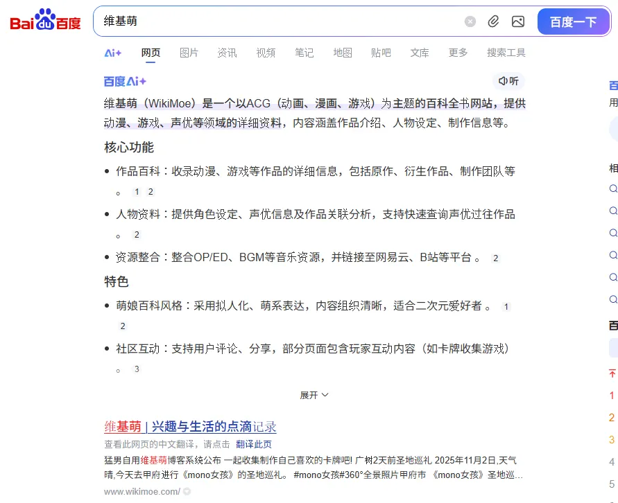 百度又可以搜到维基萌了。 怀疑百度和腾讯共用了同一套黑名单。在腾讯解除维基萌黑名单后没多久,好久都搜不到维基萌的百度又能搜到了。 另外百度这AI在瞎编什么东西??